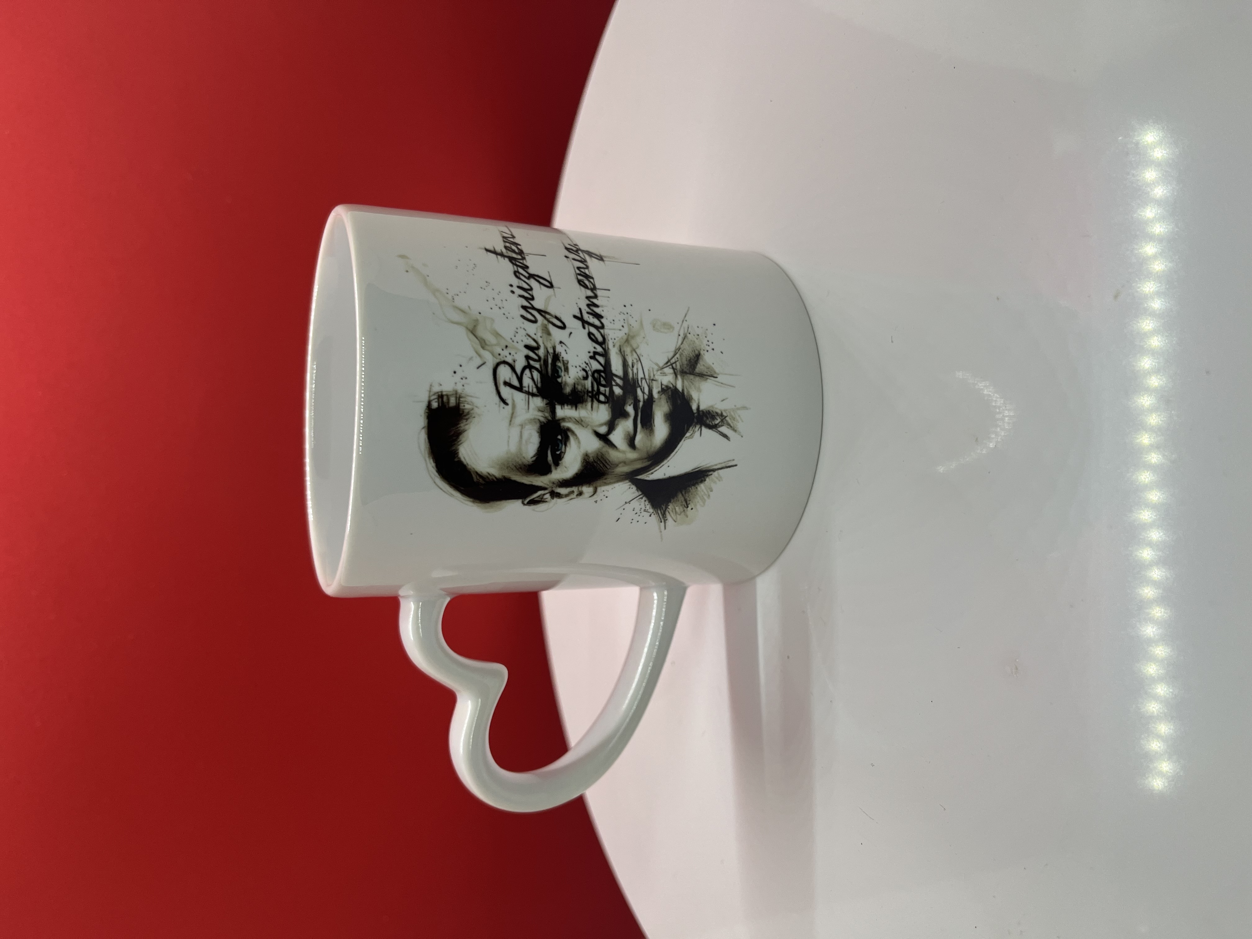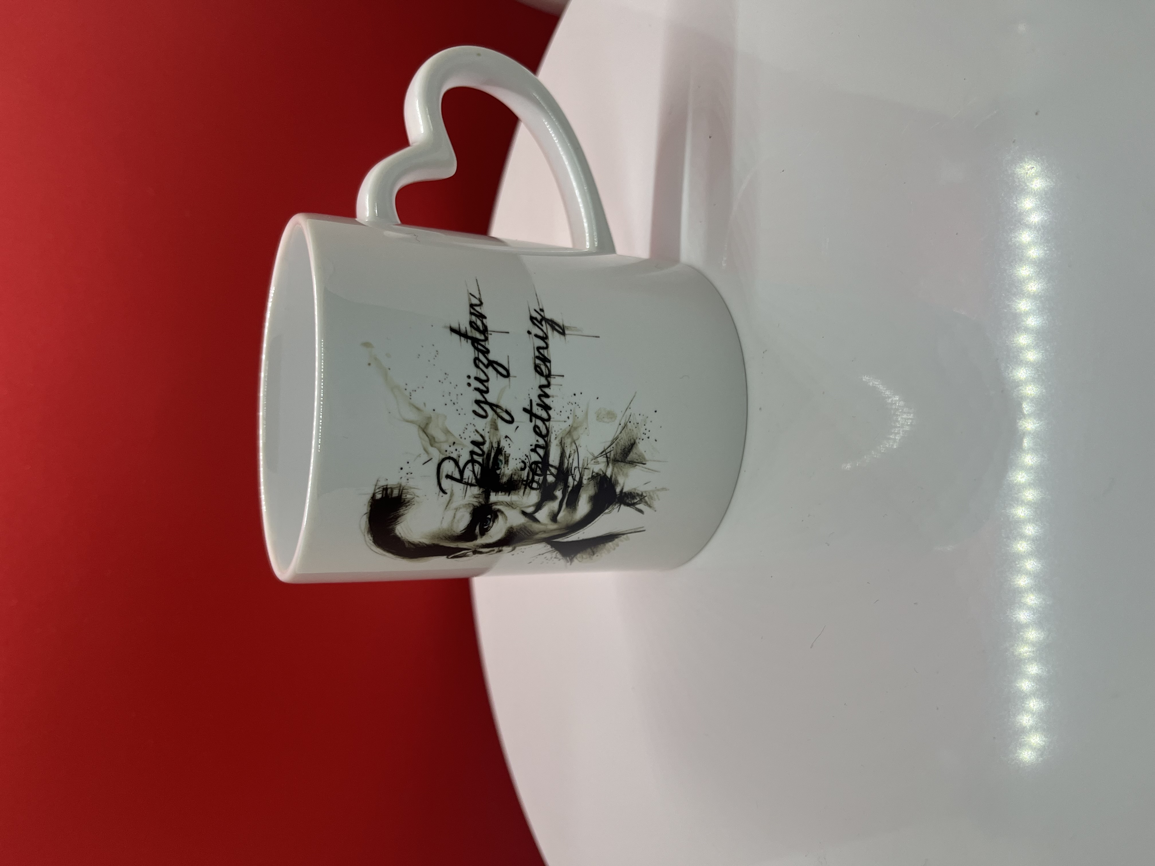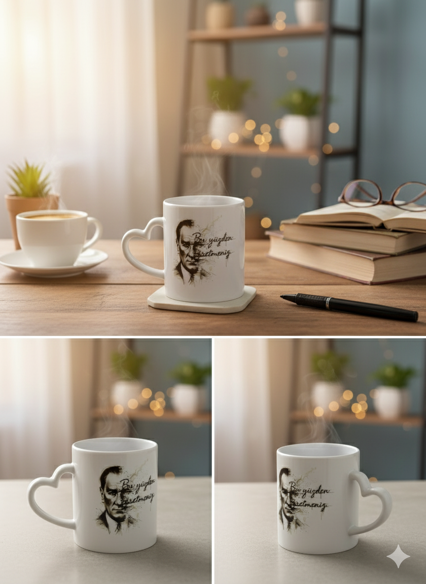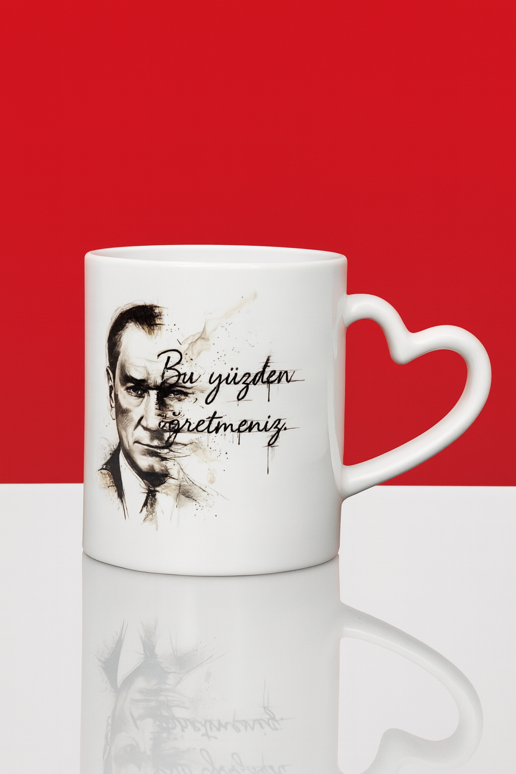 Bu özel tasarım kupa, Mustafa Kemal Atatürk’ün zarif kara kalem portresi ve “Bu yüzden öğretmeniz” sözüyle anlam kazanıyor.; Kalp şeklindeki kulbu, zarif formu ve estetik detaylarıyla hem duygusal hem de anlamlı bir hediye arayanlar için mükemmel bir seçenek.; Kara kalem tarzı Atatürk çizimi – detaylı, zarif ve sade tasarım Renkli göz detayı – bakışlara derinlik katan özgün dokunuş Kalpli kulp – sevgi ve saygıyı simgeleyen özel form Yüksek kaliteli seramik – parlak yüzey, uzun ömürlü baskı Öğretmenler Günü, 10 Kasım veya özel günler için ideal hediye Her yudumda ilham veren bir anlam taşır.;